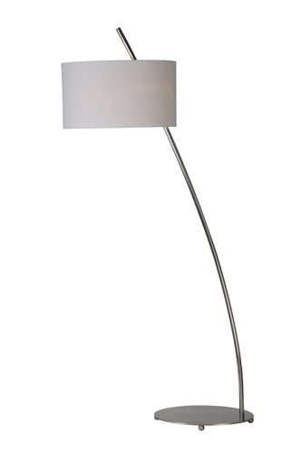 This contemporary metal body bends and extends through the oval white trimless linen shade and rests on a chic thin metal base with simple metal ball feet. Lamp measures 66-inch height. Shade measures 19-inch b 12-inch by 10-inch height. Maximum recommended bulb wattage is 100.