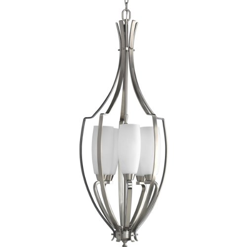 Progress Lighting P3510-09 Five-light foyer with etched glass and arching rectangular arms with strap accents. Brushed Nickel Westin Collection Brushed Nickel 5-light Foyer Pendant The Westin Collection features sweeping arcs framing elegant, tapered glass shades. Cool and modern with a casual flair, Westin provides a signature look to any room. Brushed Nickel finish Etched glass 16 In. Diameter x 42-7/8 In. Height Uses (5) 60-watt candelabra bulbs