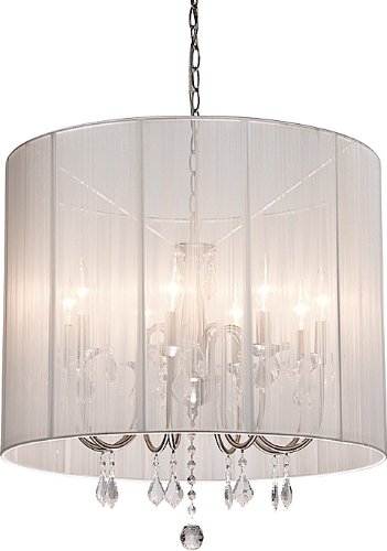Claremont's 8 lite chandelier features beautifully shaped arms in polished nickel finish, elegant crystal jewels with round shade in white string fabrics