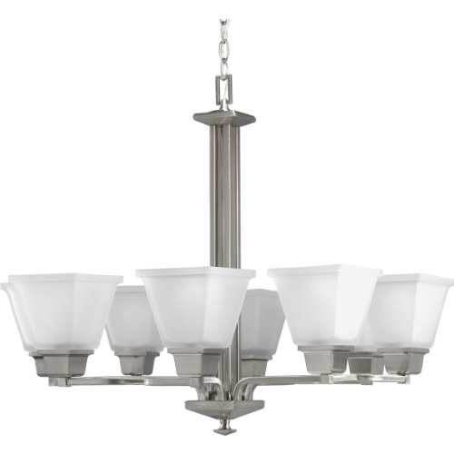 Progress Lighting P4004-09 Eight-light chandelier with clean linear forms, twin arching arms and square etched glass. Creates a modern interpretation of two blended styles: Craftsman and Mission. Brushed Nickel North Park Collection Brushed Nickel 8-light Chandelier The North Park Collection is a modern interpretation of the classic Craftsman style. Popular from turn-of-the-century through the 1930's, this artistic style continues to see renewed popularity due to it's clean, simple and honest designs. North Park features unique arching linear arms which support etched glass to provide a softly diffused lighting effect. Brushed Nickel finish Etched glass 27-1/4 In. Diameter x 24-5/8 In. Height Uses (8) 100-watt medium base bulbs