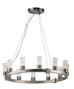 This twelve light round chandelier from the Revolution Collection is perfect for an entry or dining area. A luminous satin nickel finish frame complements etched clear glass cylinders. By Forecast Lighting.