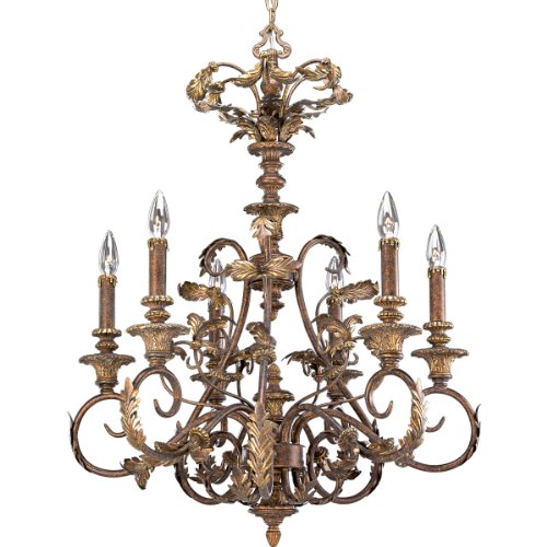 Progress Lighting P4026-02 Six-light chandelier with dainty leaf accents and curvaceous scrolls. Golden Brandy Thomasville Lighting Collection Elysian Collection Golden Brandy 6-light Chandelier Delicate leaves intertwine for a lacy, graceful grandeur. This fine European styled ensemble bespeaks the true nature of fine craftsmanship. Featured in the finely aged Golden Brandy finish, the Elysian Collection is the perfect way to add elegance to any room. Golden Brandy finish Matching hand painted candle sleeves 26-3/4 In. Diameter x 33-3/4 In. Height Uses (6) 60-watt candelabra bulbs